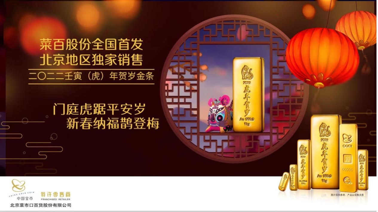 賀歲金銀條、喜字形金銀紀念章更是憑藉“權威發行、專業鑄造、品質精良、宜禮宜藏”的優勢捕獲了大批消費者的芳心。全國首發、北京地區獨家銷售2022壬寅(虎)年賀歲金條,是中國金幣集團有限公司(原中國金幣總公司)發行的第20組賀歲金條,作為國內首款生肖賀歲金條,也是菜百賀歲季連續熱銷20年的重磅項目,發行售價為429元/克。