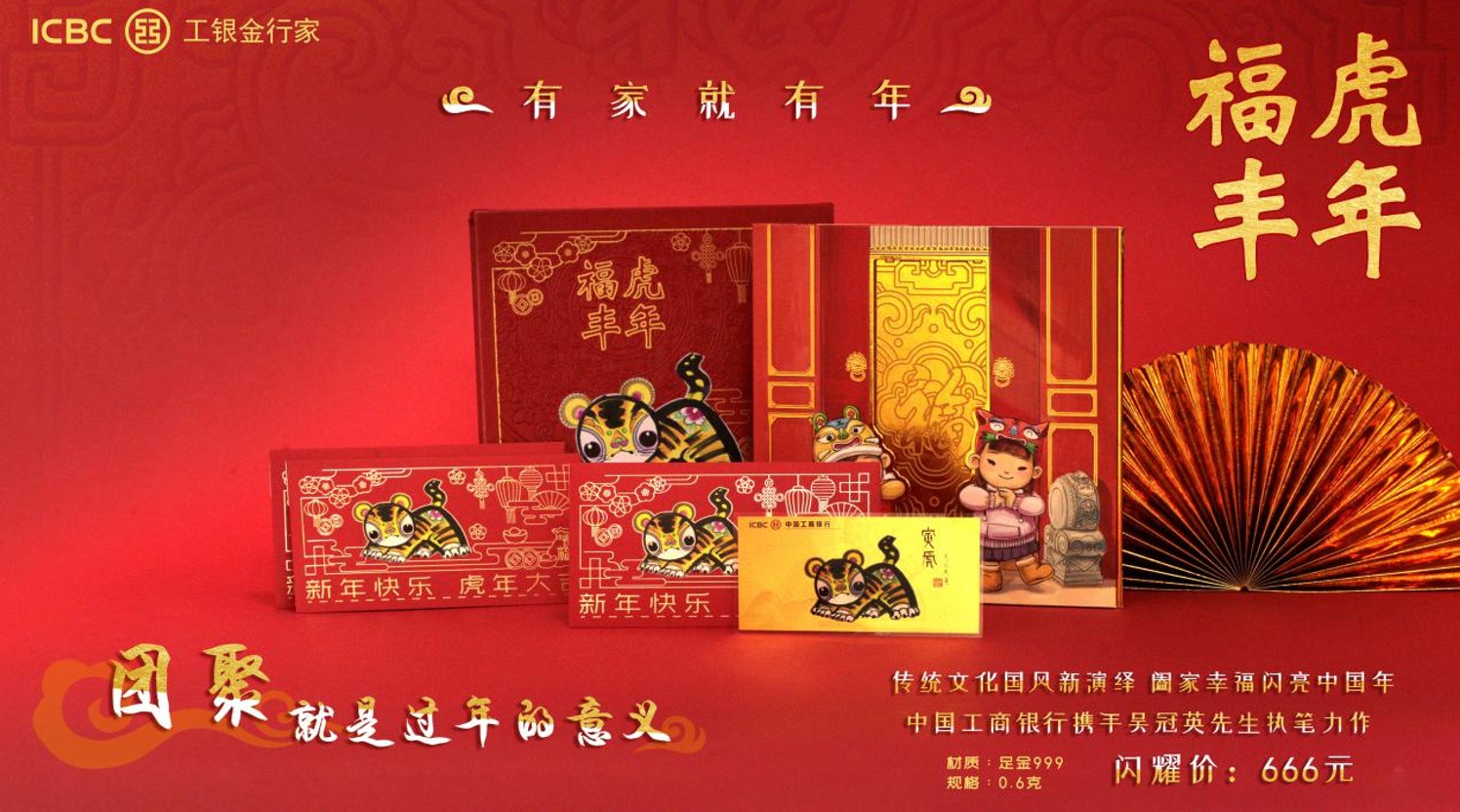 銀行機構推出的賀歲貴金屬產品也分外亮眼。比如工銀金行家推出了“大師十二生肖傳世金·福佑虎”、“福虎豐年”等賀歲產品。其中“福虎豐年”賀歲金卡一套售價666元,用貴金屬結合國風插畫的形式,描繪了新春佳節、福虎盈門的喜慶場面,以國風卡通形象描繪温暖幸福,寄託對新春好年節的美好祝福。多層開折的包裝結構,打開的每層畫面相連,描述了一個春節回家的故事。巧妙的摺疊結構形成一個立方體的展示空間,直觀地表達閤家團圓過新年的概念,傳遞喜慶與温暖。