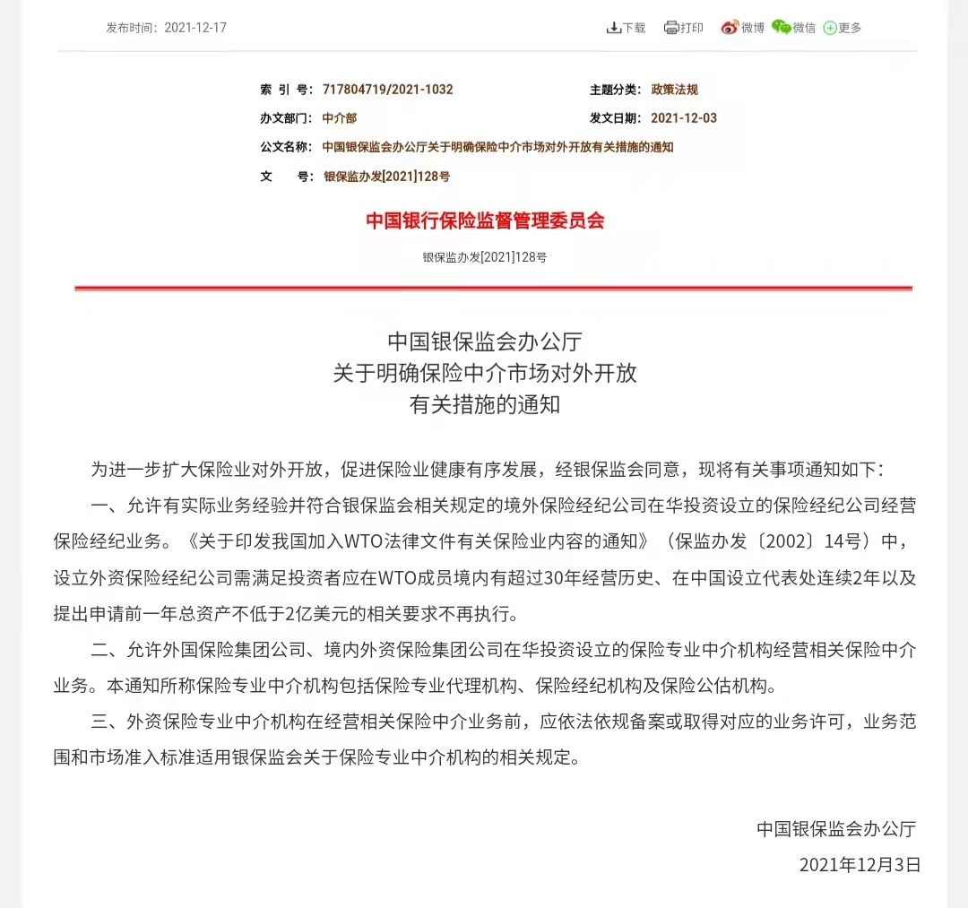 在保險市場,進一步開放措施也已明確。12月3日,銀保監會辦公廳發佈《關於明確保險中介市場對外開放有關措施的通知》,允許有實際業務經驗並符合銀保監會相關規定的境外保險經紀公司在華投資設立的保險經紀公司經營保險經紀業務。同時,允許外國保險集團公司、境內外資保險集團公司在華投資設立的保險專業中介機構經營相關保險中介業務。