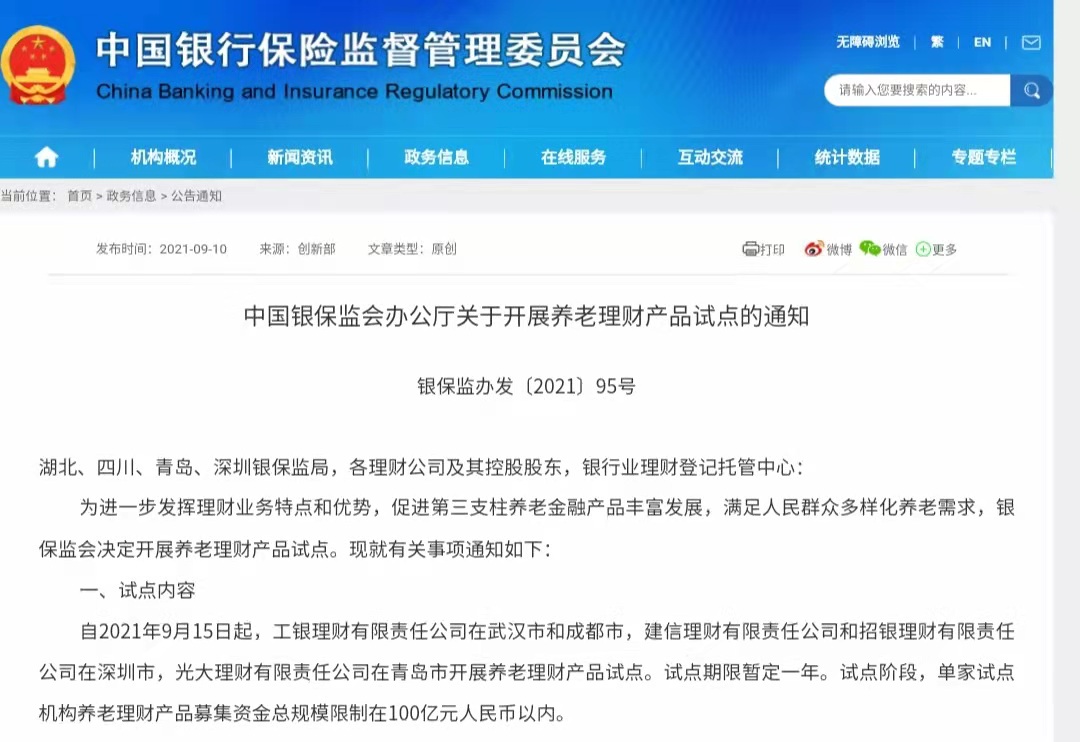 9月15日起,銀保監會選擇“四地四家機構”開展養老理財試點——工銀理財在武漢市和成都市,建信理財和招銀理財在深圳市,光大理財在青島市。經過三個月的準備,12月6日,四家機構首批養老理財產品正式發售。