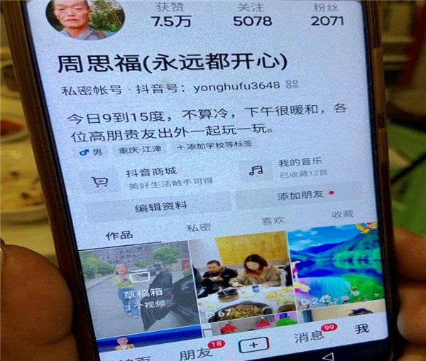 最近,周思福迷上了一個短視頻軟件,閒暇之餘他會將日常生活分享在自己的賬號裏。拍攝、剪輯、配上歡快的BGM……周思福玩得比許多年輕人還明白,賬號粉絲很快漲到2000多人,獲得了7.5萬的點贊。