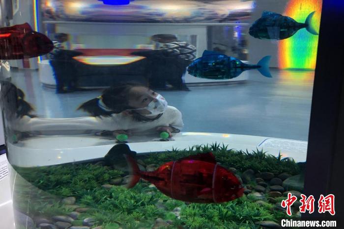 中國科技館“智能”展廳攜多款機器人亮相,兒童觀眾仔細觀賞機器魚演示。中新社記者 孫自法 攝