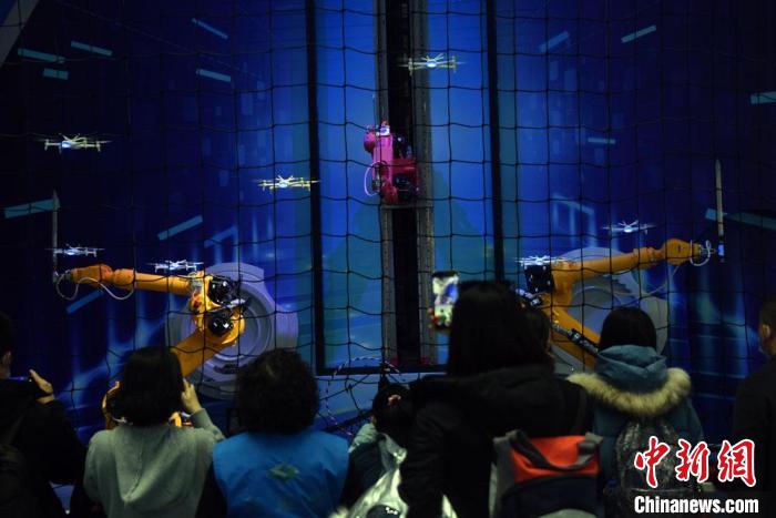 中國科技館“智能”展廳攜多款機器人亮相,無人機羣與多台機械臂協同表演。中新社記者 孫自法 攝