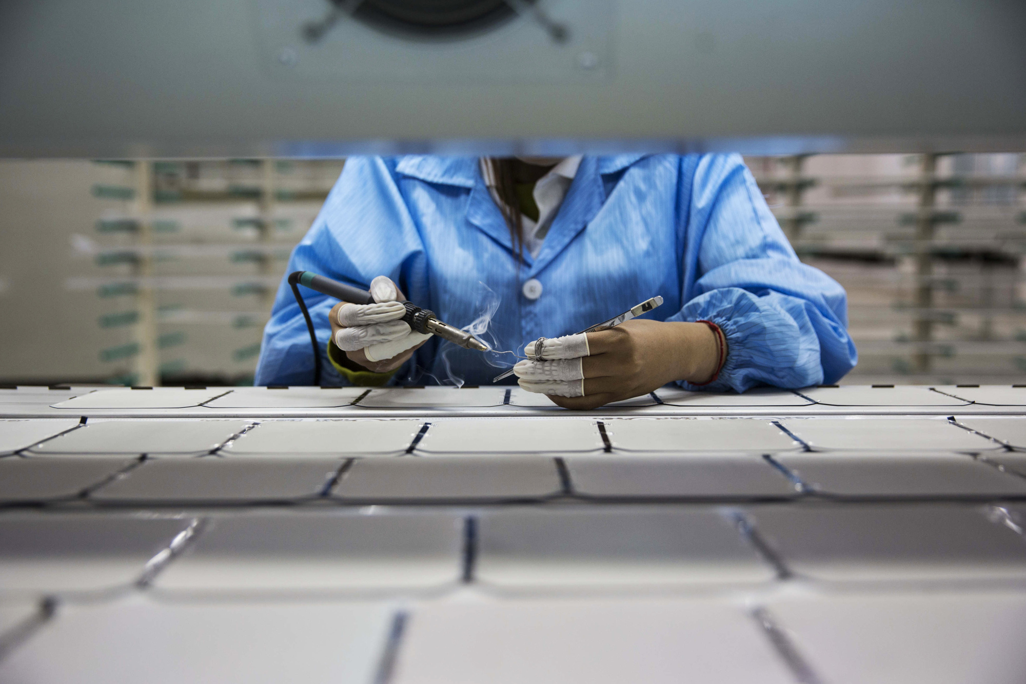 一名工人在柬埔寨金邊的一家工廠裏焊接太陽能電池模塊。