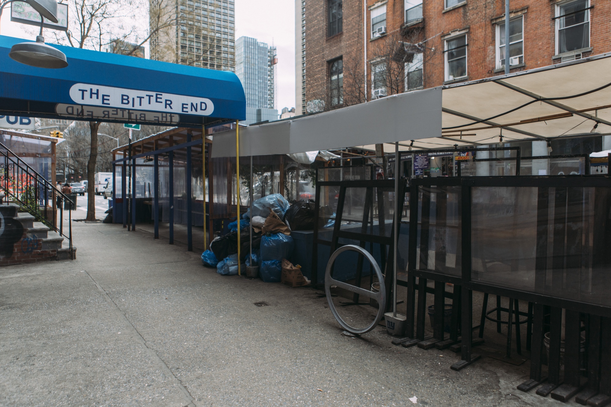 格林威治村户外餐飲結構之間堆積的垃圾。攝影師:埃米爾·科恩/市議會工作人員社區委員會2號區的區經理鮑勃·戈姆利在遊覽中表示,他看到了臨時計劃對他社區的後果。“我這裏有關於垃圾堆積到七英尺高的照片,”戈姆利指着一個户外用餐棚旁邊的垃圾堆説。當被問及他理想的永久解決方案是什麼時,他笑了。“首先,會有一些執法,”戈姆利説。
