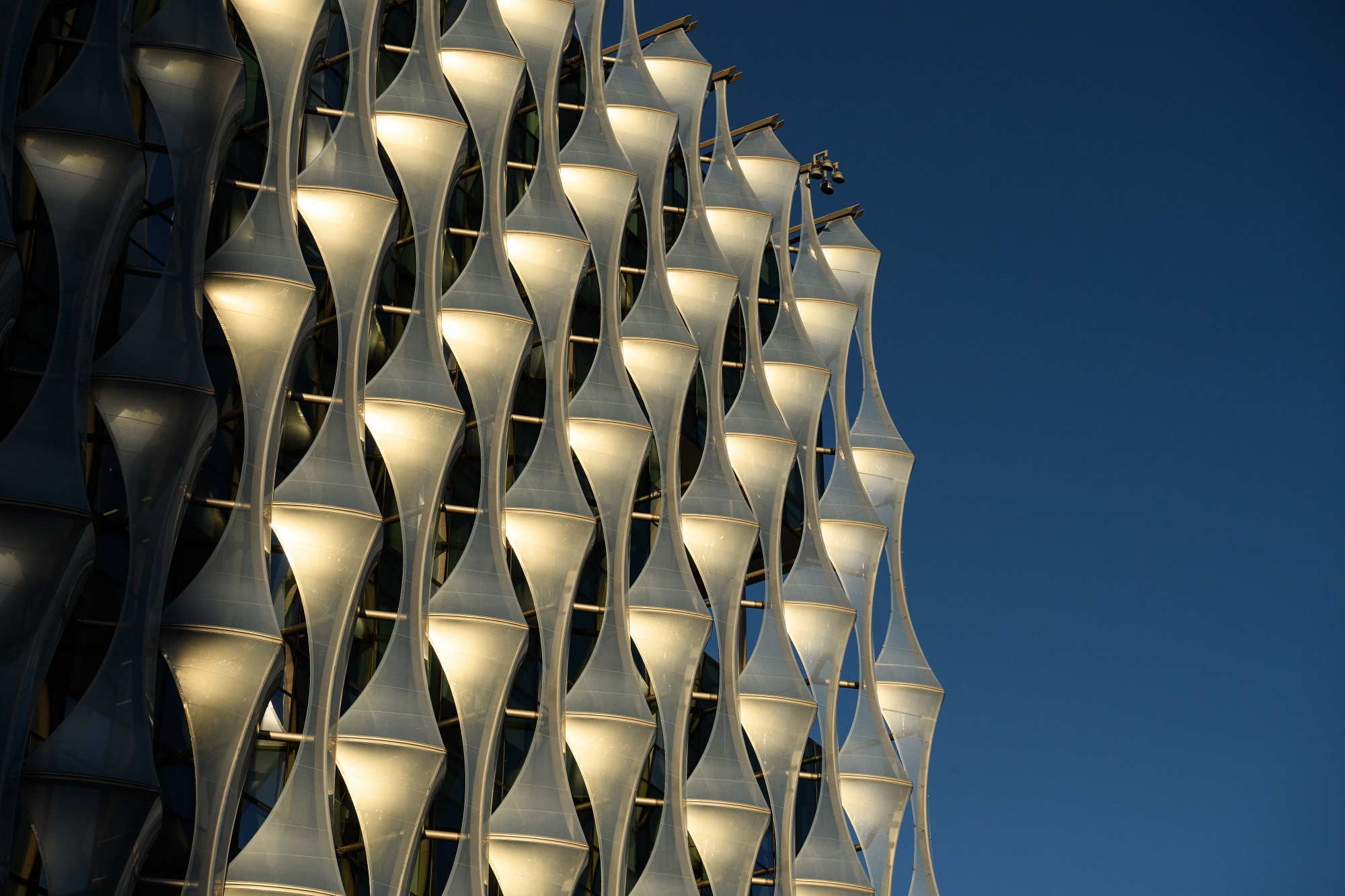 Transsolar幫助斯圖加特建築師Stefan Behnisch設計了一個優雅的小金屬罩網,遮蓋了哈佛大學科學與工程綜合體的實驗室,該綜合體於去年完工。這個網格經過精心校準,可以反射不需要的太陽熱量和眩光,同時可以清晰地看到外面的景色,並引入陽光,從而在白天避免使用電燈。窗户也可以打開,以捕捉季節性的微風。