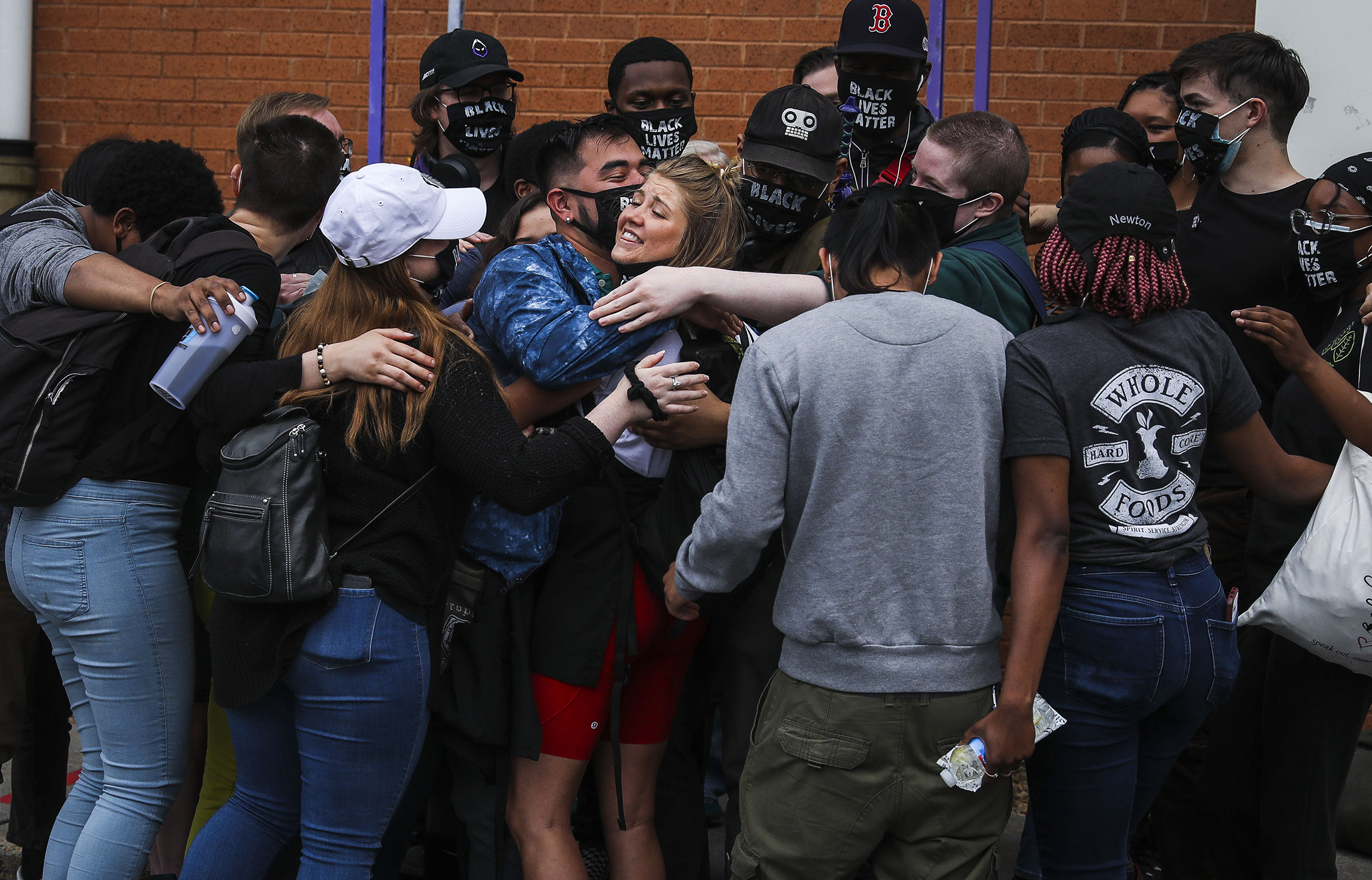 金澤(中)在2020年6月30日劍橋的一次抗議活動中受到 Whole Foods 員工的擁抱。攝影師:Erin Clark/Getty Images阿布魯佐一方有一些領先的勞工法專家支持她。前國家勞工關係委員會總法律顧問理查德·格里芬表示,BLM 的信息與任何有種族歧視索賠歷史的工作場所相關。“當亞馬遜和 Whole Foods 能夠説他們在種族正義問題上的記錄是無可挑剔的那一天,他們就可以正大光明地提出這些論點了,”他説。前 Whole Foods 員工作證稱,同事曾穿着支持 LGBTQ 驕傲、NFL 的新英格蘭愛國者隊和粑粑表情符號的服裝,都沒有引起任何事件。