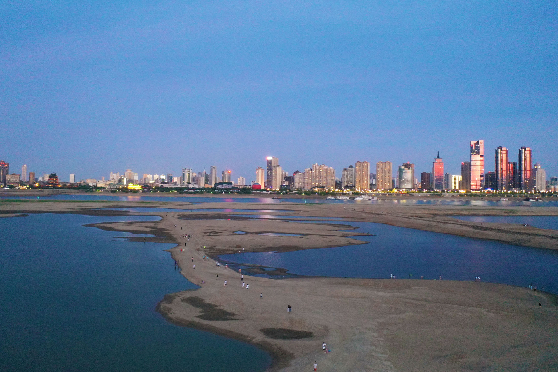 中國南昌贛江干涸的河牀上人們行走,拍攝於8月22日。攝影師:Liu Zhankun/China News Service/Getty Images