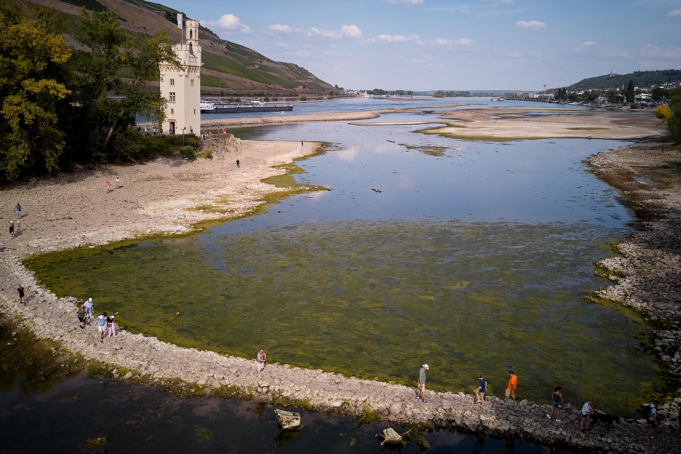 德國賓根附近的萊茵河上的一個島嶼,是賓根老鼠塔的所在地,由於水位較低,可步行前往,拍攝於8月14日。攝影師:托馬斯·弗萊/圖片聯盟/蓋蒂圖片社
