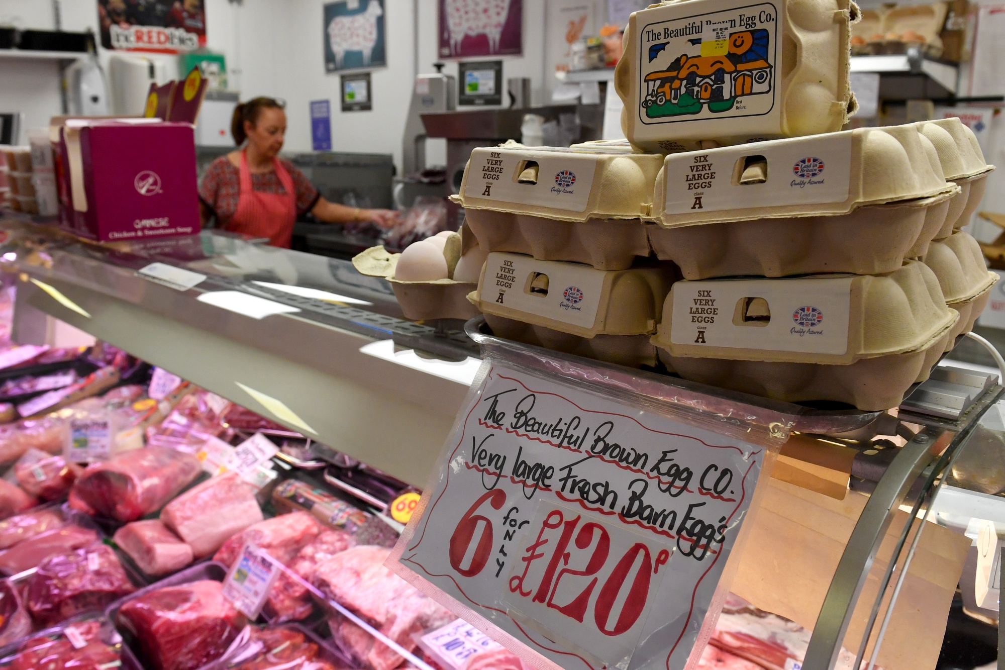 在英國利物浦的一家肉店攤位上展示的雞蛋價格。自利茲·特拉斯(Liz Truss)上任首相以來,英國股票和債券市場的總市值已經至少蒸發了5000億美元,投資者信心受到了一場意外減税預算的重創。