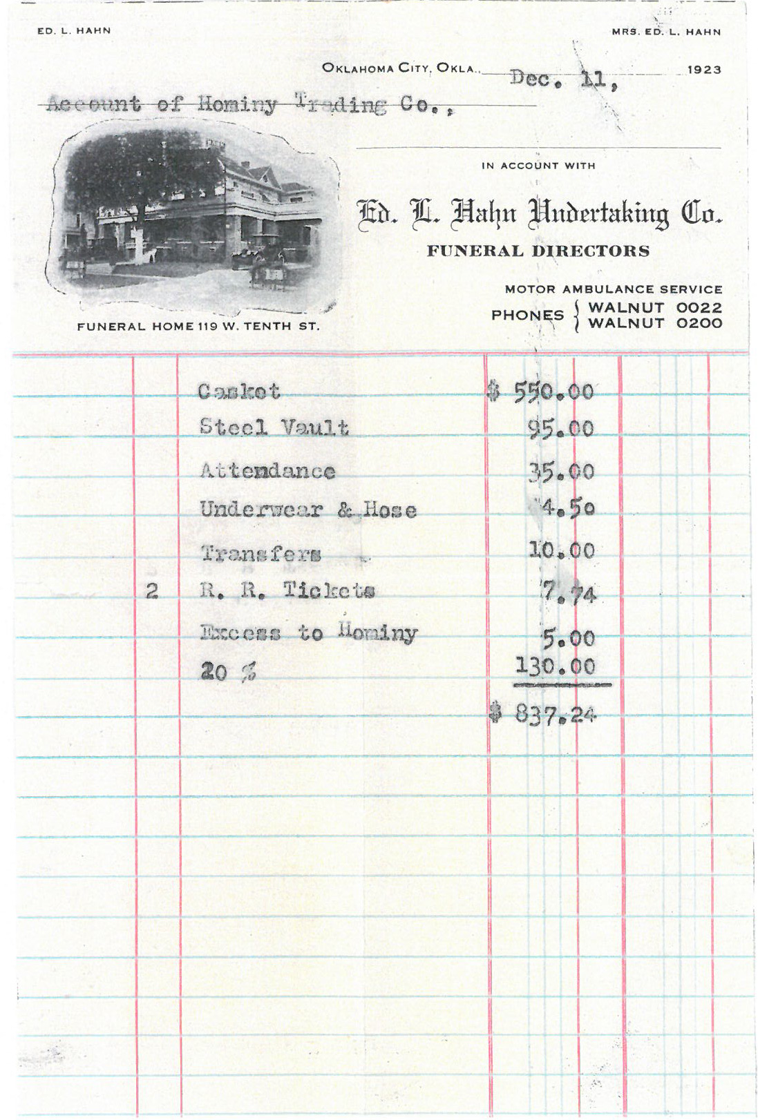 瓦赫雷什在俄克拉荷馬城接受服務的明細賬單,在他的遺體被帶回霍米尼之前。照片:哈恩-庫克/斯特里特和德雷珀殯儀館