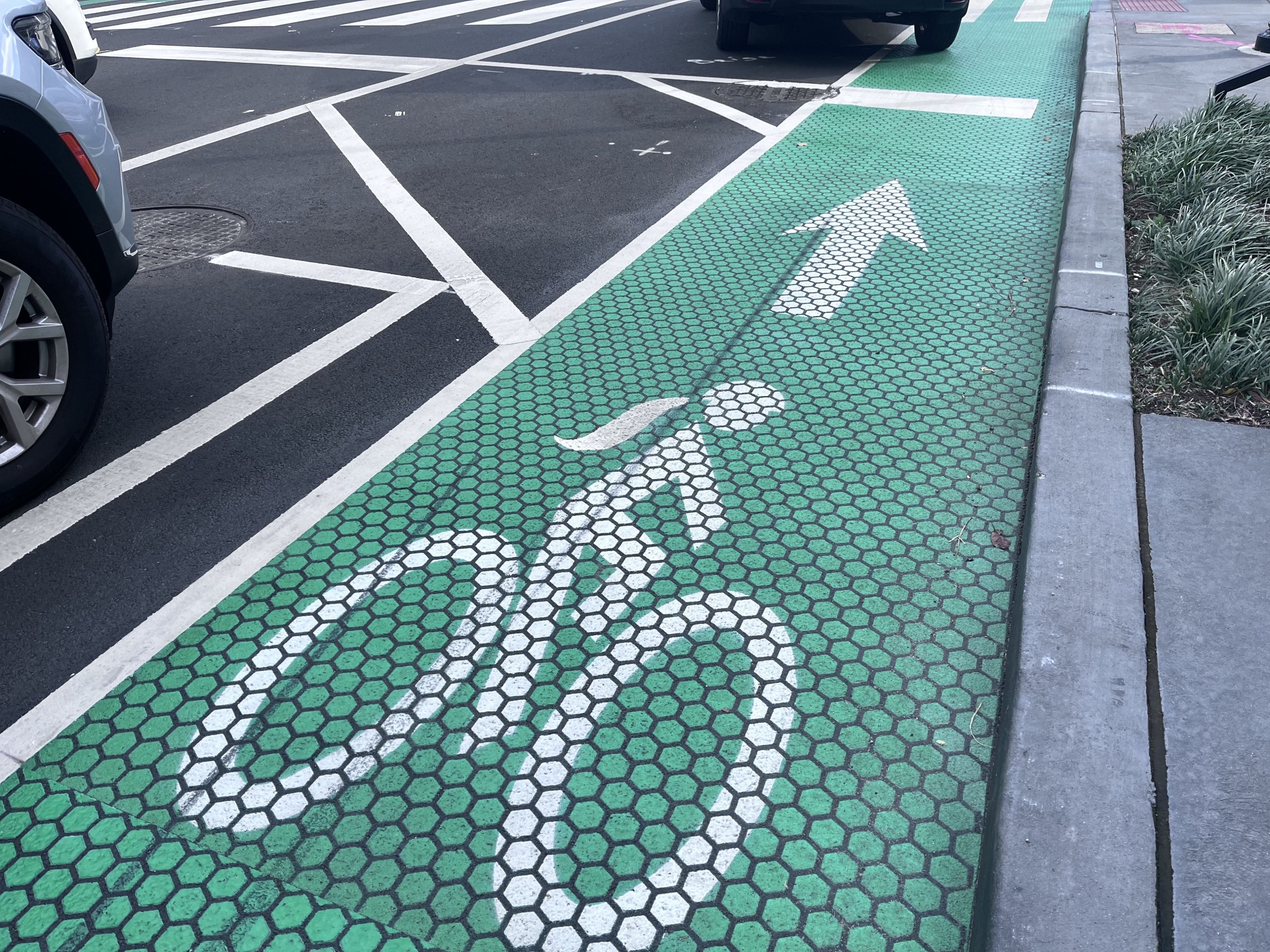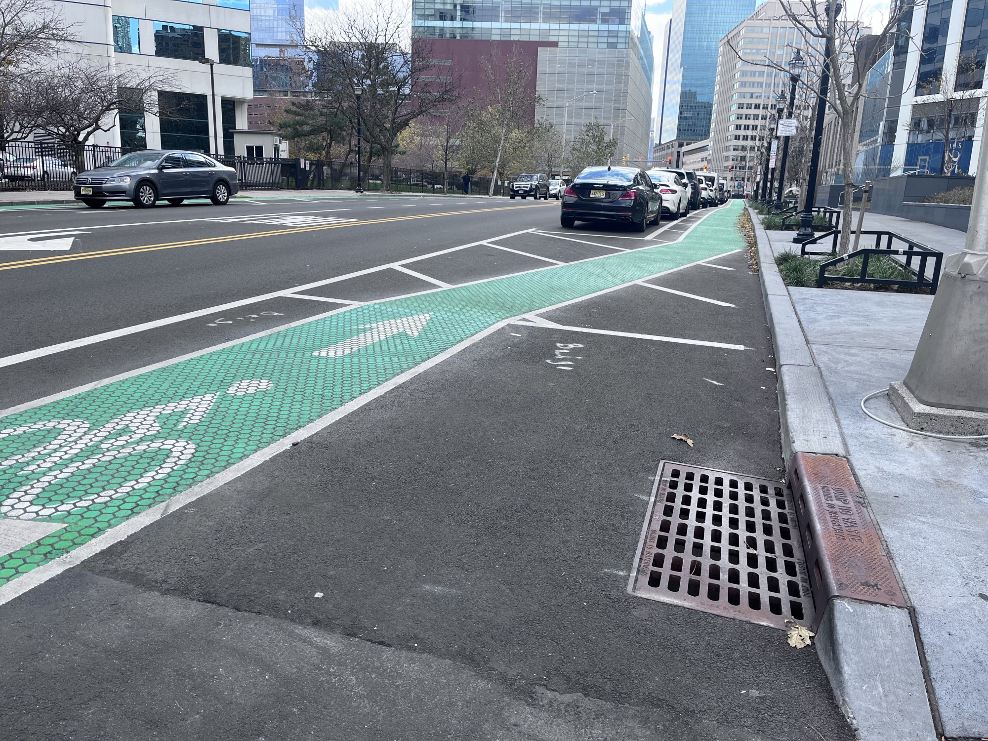 在之前的幾次訪問中,我看到大多數當地自行車道都是標準的,用亞克力綠色或白色油漆劃線;有一些是用塑料柔性柱與交通隔開的。但我注意到最近幾周發生了變化。許多車道,特別是新建的延伸至霍博肯北部的車道——該州另一個“Vision Zero”城市——都被塗上了Endurablend,這是一種聚合水泥塗層,其凹凸圖案使油漆看起來像是路面的一部分。而且不再只有柔性柱保護,現在它們被各種東西保護着:混凝土波形隔離欄、桶、錐形標或車輛停車。