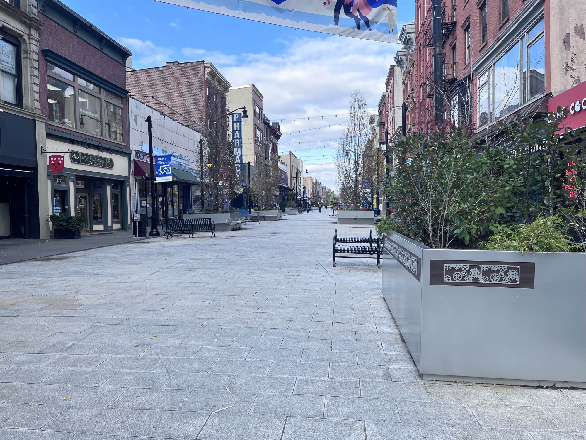 紐瓦克大道的一段被改造成了僅供行人通行的購物中心。照片:約翰·蘇里科/彭博城市實驗室“我們利用了街上車輛較少的機會,”市長史蒂夫·富洛普在辦公室接受採訪時説。“我們説,讓我們嘗試做一些在正常情況下可能不那麼容易做到的事情。其中包括對道路進行大量重新設計。”