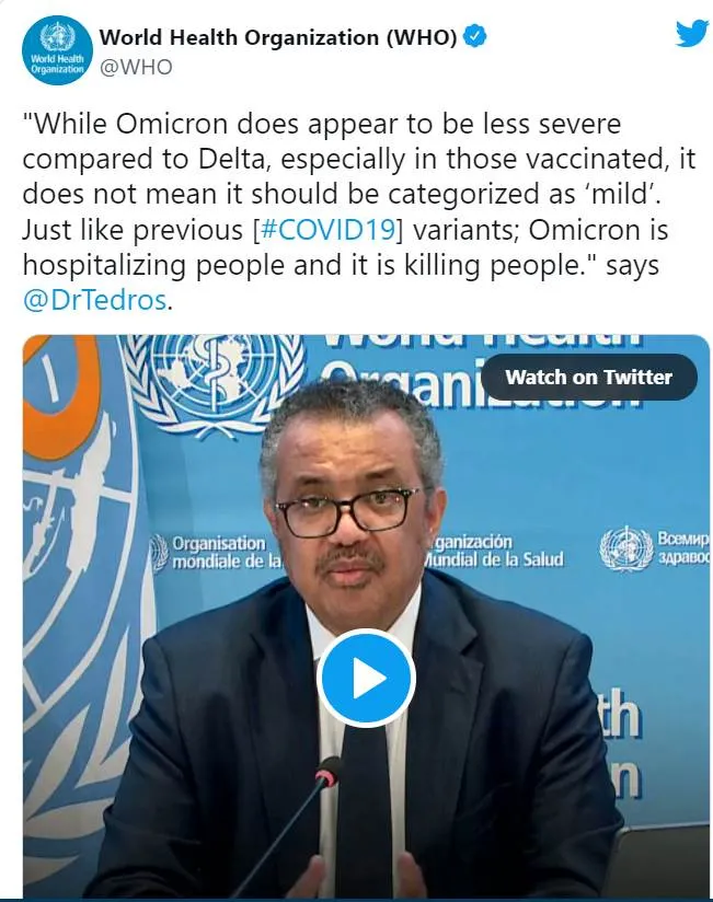 世衞總幹事譚德塞指出,“雖然與Delta相比,Omicron的確沒有那麼嚴重,但這並不意味着可以歸類為輕症。”