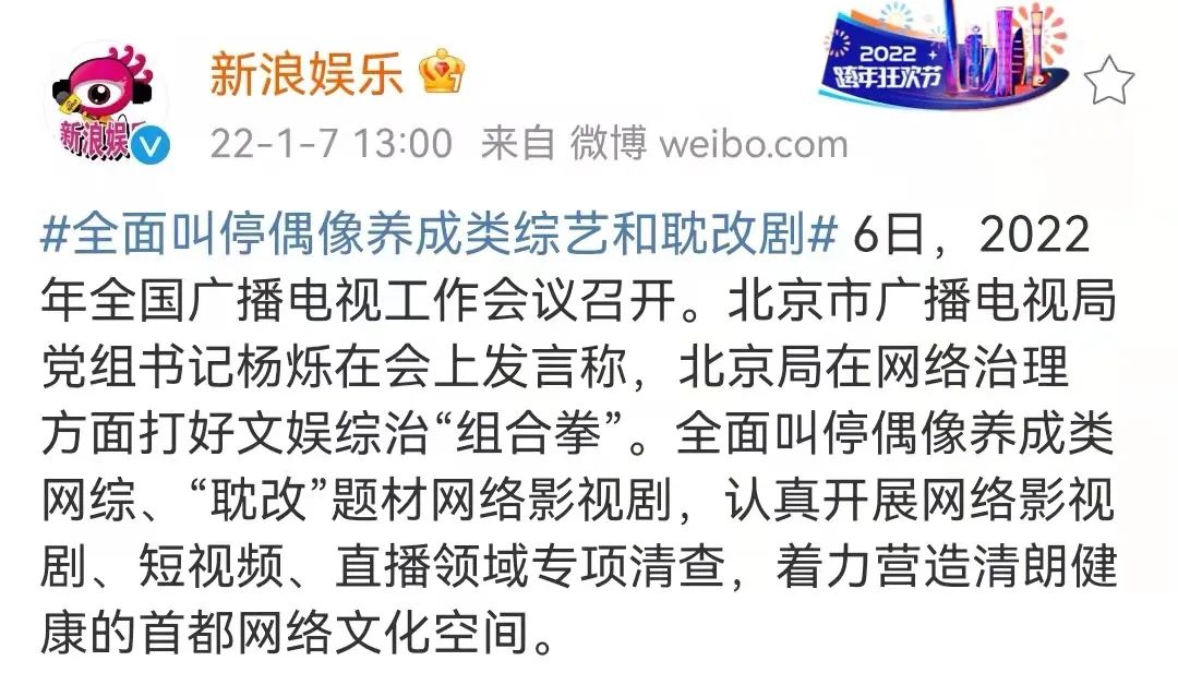 2022年1月6日,北京局宣佈全面叫停偶像養成類網綜。