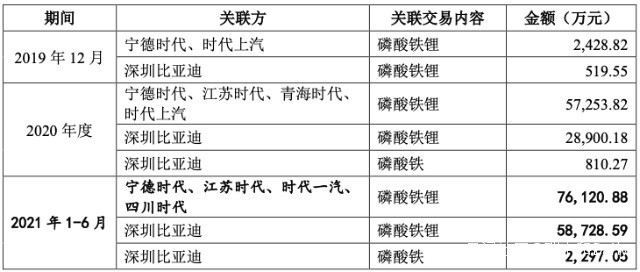 訂單爆發之下,湖南裕能2021年上半年實現營收14.45億元,淨利潤2.09億元。而其2020年全年的營業收入也才9.55億元,淨利潤只有0.46億。2021年上半年的營收、淨利潤分別超過2020年全年的1.5倍和4.5倍。高額關聯交易無疑是監管機構對IPO企業問詢的重點之一。那麼,湖南裕能的關聯交易公允性如何呢?招股書顯示,湖南裕能磷酸鐵鋰在2021年上半年的銷售單價為4萬元/噸,其中一季度銷售單價為3.44萬元/噸。而生意社數據顯示,2021年1月5日,德方納米、貝特瑞(835185.BJ)、光華科技(002741.SZ)的動力型磷酸鐵鋰報價均為3.8萬元/噸,3月31日為4.8萬元/噸,6月30日進一步漲至5萬元/噸。也就是説,湖南裕能無論是2021年一季度的銷售價,還是整個上半年的價格,均明顯低於市場價。實際上,2021年以來磷酸鐵鋰正極材料價格一直處於只漲不跌的行情。生意社數據顯示,德方納米、貝特瑞、光華科技等企業2021底的報價已經突破11萬元/噸,全年漲幅約190%,價格創3年以來新高。**數****十倍新增產能能否消化?**數據顯示,2020年整個磷酸鐵鋰正極材料市場的出貨量也就12.4萬噸。這其中,湖南裕能2020年磷酸鐵鋰產量3.1萬噸,銷量3.13萬噸,2020年設計產能為2.94萬噸;德方納米2020年磷酸鐵鋰產量3.25萬噸、銷量3.07萬噸;貝特瑞2020年正極材料產量2.08萬噸、銷量2.14萬噸(未單獨披露磷酸鐵和三元材料產銷量)。到了2021年,受益於磷酸鐵鋰電池的高景氣度,磷酸鐵鋰材料出貨量大增,僅上半年出貨量就已超過2020全年,達到17.8萬噸。火熱的市場自然引起資本的關注,擴產也是必然。比如,此次湖南裕能就打算募資18億元,其中13億元用於四川裕能三期、四期年產6萬噸磷酸鐵鋰項目建設,建設期2年,達產後年產能將增長12萬噸,相當於2020年整個市場的出貨量。除了上述12萬噸募投產能,湖南裕能還有貴州裕能的年產15萬噸磷酸鐵鋰生產線項目、磷礦石全量化利用年產20萬噸磷酸鐵鋰前驅體(新型能源材料)生產線項目、年產15萬噸磷酸鐵鋰及磷礦石全量化利用年產10萬噸磷酸鐵鋰前驅體(新型能源材料)生產線項目,雲南裕能的年產24萬噸磷酸鐵和16萬噸磷酸鐵鋰生產線項目,銅陵安偉寧新能源的5萬噸/年高壓實磷酸鐵產業化升級改造項目已在路上。如果上述產能全部投產,湖南裕能的磷酸鐵鋰產能將翻升幾十倍。如此大的產能增幅消化得了嗎?要知道,湖南裕能可以擴產,其他同行也在擴產。目前,包括德方納米、昇華科技、北大先行、湖北萬潤等磷酸鐵鋰材料企業都在擴充產能和提升產能利用率。此外,龍蟒集團(002601.SZ)、中核鈦白(002145.SZ)、川發龍蟒(002312.SZ)等一大批新玩家也蜂擁而來,紛紛加入磷酸鐵鋰材料產能競賽。僅最近兩週,就有多家磷酸鐵鋰投擴產的消息傳出。