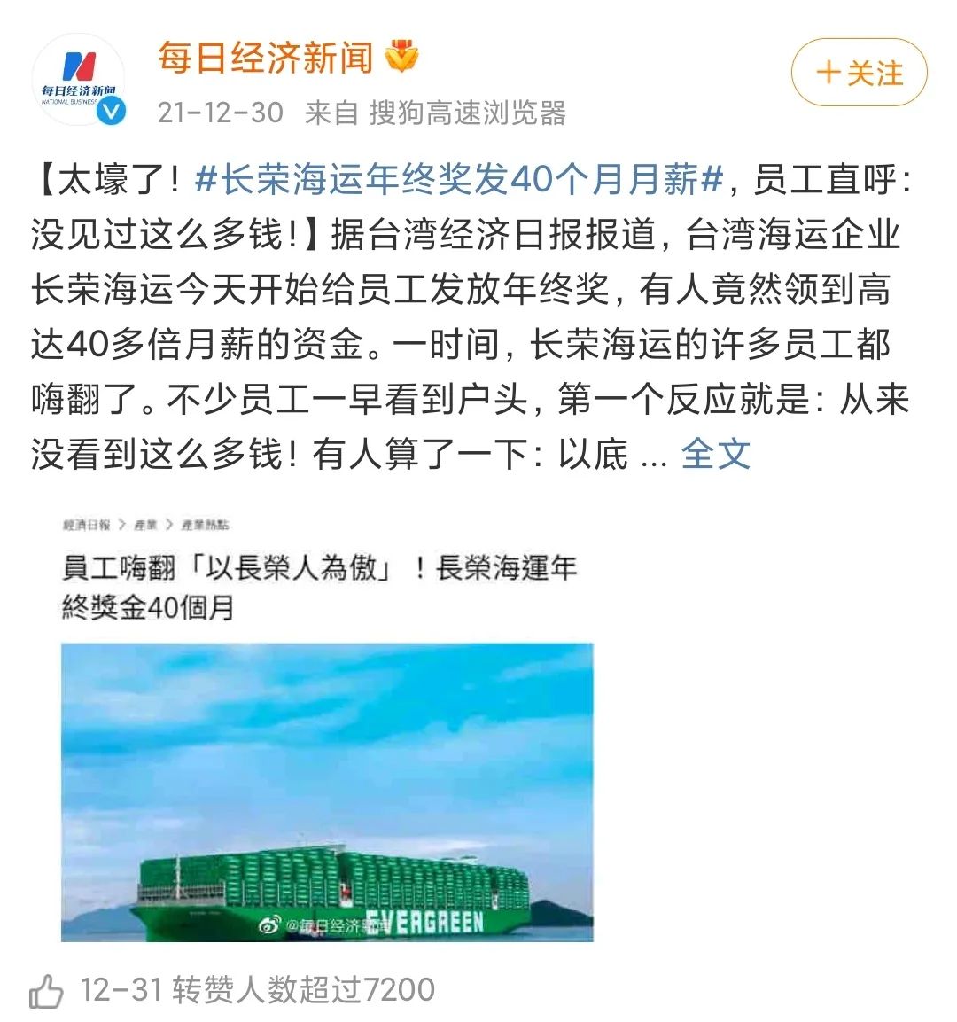 他們會留下這樣的印象,熱搜難辭其咎。比如前陣子,台灣海運企業長榮海運給員工發放年終獎,有人竟然領到高達40多倍月薪的獎金。