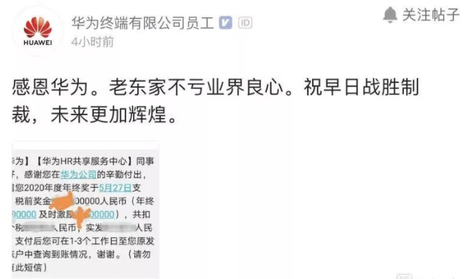 而在最近幾年,幾乎每年都會有華為的離職員工在網上感謝前東家,他們也在離職後照樣拿到了數目不小的年終獎。