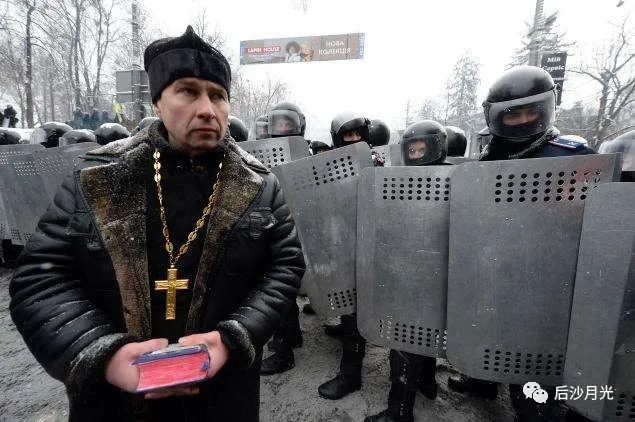 而媒體上畫面是這樣的,勇敢的東正教神父在獨自面對軍警。
