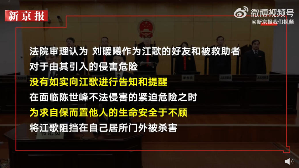 法院審理認為,劉暖曦作為江歌的好友和被救助者,對於由其引入的侵害危險,沒有如實向江歌進行告知和提醒,在面臨陳世峯不法侵害的緊迫危險之時,為求自保而置他人的生命安全於不顧,將江歌阻擋在自己居所門外被殺害,具有明顯過錯,應當承擔相應的民事賠償責任。
