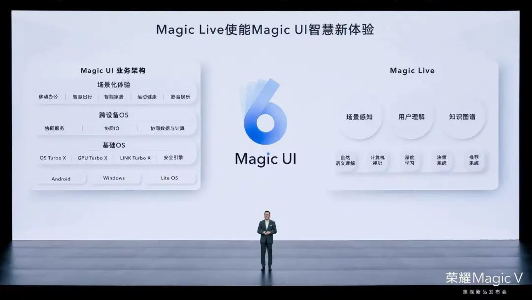 國產手機廠商塑造高端之旅的過程中,操作系統的底層創新也愈發重要。榮耀Magic V首發Magic UI 6.0系統,其被官方稱之為由Magic Live智慧引擎使能的AI全場景智慧操作系統,配合OS Turbo X、GPU Turbo X和LINK Turbo X技術性能引擎,力爭打造適合每個人使用習慣的個性化OS。