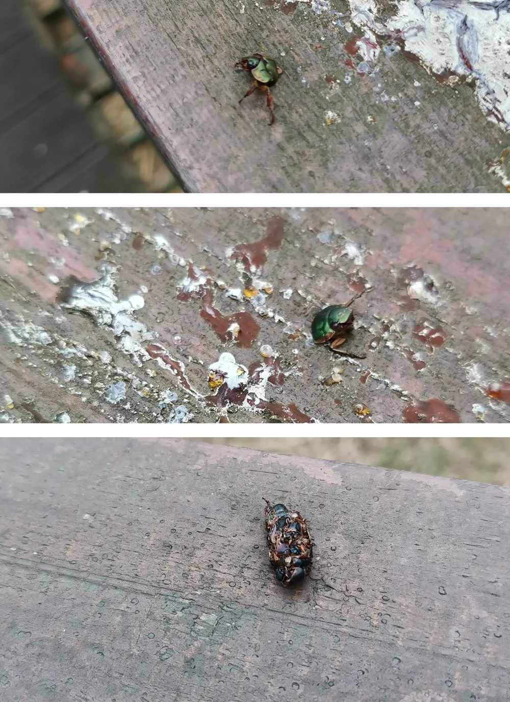 棧道護欄上有很多金龜子屍體,腦袋被扯掉,身子似乎是被半消化吐出來的,有點像貓頭鷹的食丸。