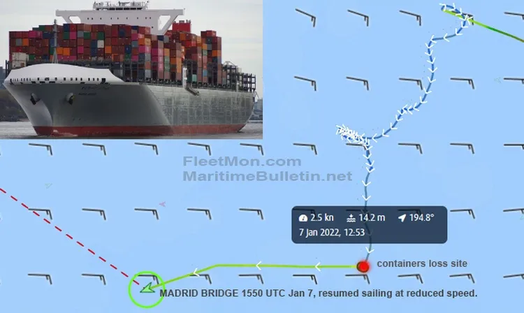 Fleetmon報道稱“Madrid Bridge”輪落水丟失的集裝箱數量很可能超過30個。截至UTC時間1月11日0410時,該輪在向南行駛了很長一段時間後,正減速向西行駛,顯然是為了避免不利的天氣並保持最安全的航向和速度。