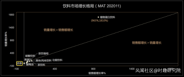 根據天貓新品創新中心公佈的報告,在所有飲料品類中,涼茶增長格局略顯尷尬,整體銷量增長率和銷售額增長率處於幾乎墊底的位置。