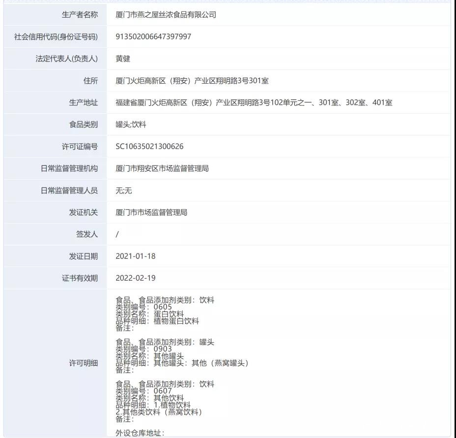 頗有意思的是,燕之屋的燕窩可能連“保健品”都算不上。從國家市場監管總局的網站查詢能看出,燕之屋真正加工燕窩的主體——廈門市燕之屋絲濃食品有限公司持有的食品生產許可證,表明這家公司生產所有的產品是罐頭和飲料。