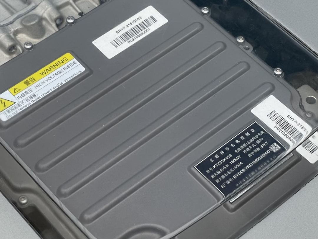 説回這個原型概念底盤,除了 4G 網絡接收模塊、比較完整的懸架結構外,我在後電機上發現了有趣的地方,這是一台可能來自比亞迪的 150 kW 永磁同步液冷電機,印象中這可能是比亞迪第一次這樣輸出三電產品吧?