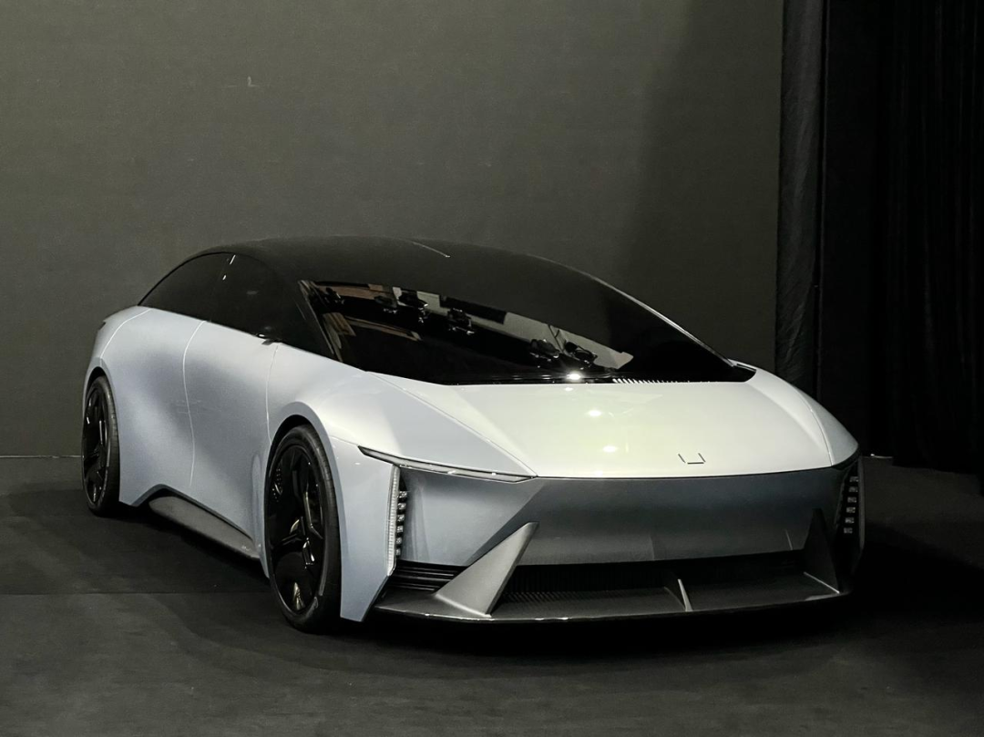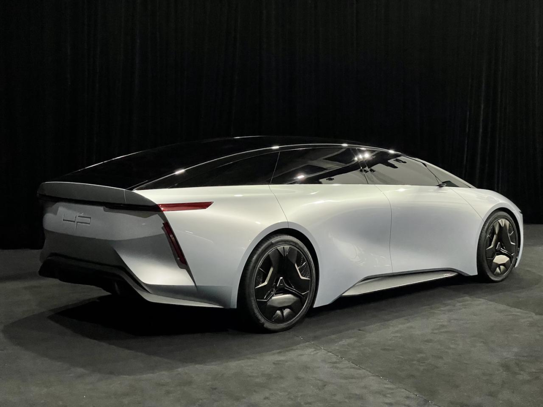 這是一款轎跑產品。可以看到從車頭到尾部有一個連續的弧面,包括車尾設計還有利於改善氣動效果,被現場的工作人員戲稱為奔馳 EQXX 概念車的平替。
