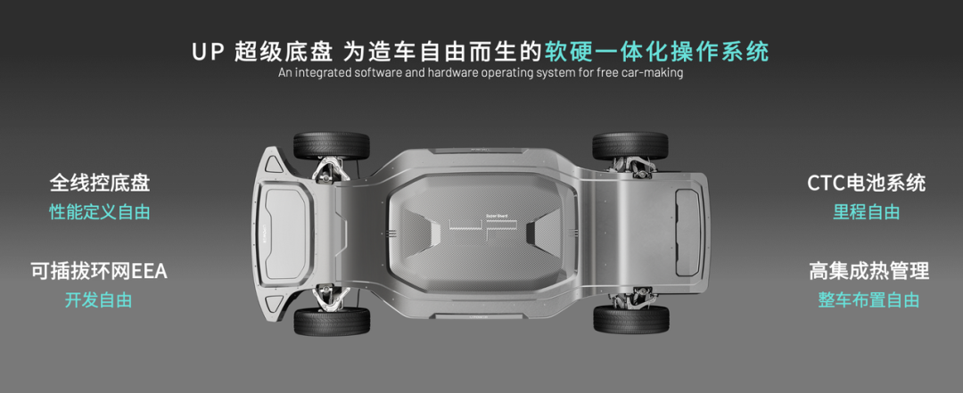悠跑官方稱「UP 超級底盤」是由滑板底盤升級而來的。具備集成傳統白車身的能力,同時進一步集成了三電、懸掛、制動、轉向、電池、電動傳動系統、懸架等部件。