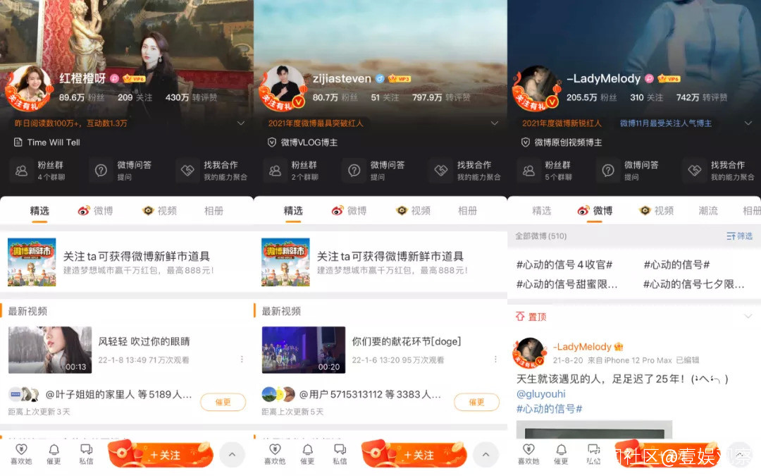 回看2021年的國內戀綜,一些素人嘉賓獲得關注和熱度比往年要更火熱一些。《心動的信號4》中不少人的微博粉絲數持續增加,原本就有積累的Melody粉絲超過200萬,陳思銘、馬子佳、洪成成等人微博粉絲都突破80萬,不少內容的點贊、評論數據都很亮眼。這樣的不錯的數據,也繼續轉移到他們所運營的小紅書、抖音等平台上。