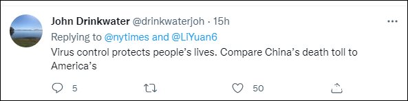 讓人噁心的是,《紐約時報》試圖將“控制病毒”和“人民的福祉和尊嚴”對立起來。也許美國媒體應該要關注美國自己對奧密克戎糟糕的應對,而不是責罵別人。