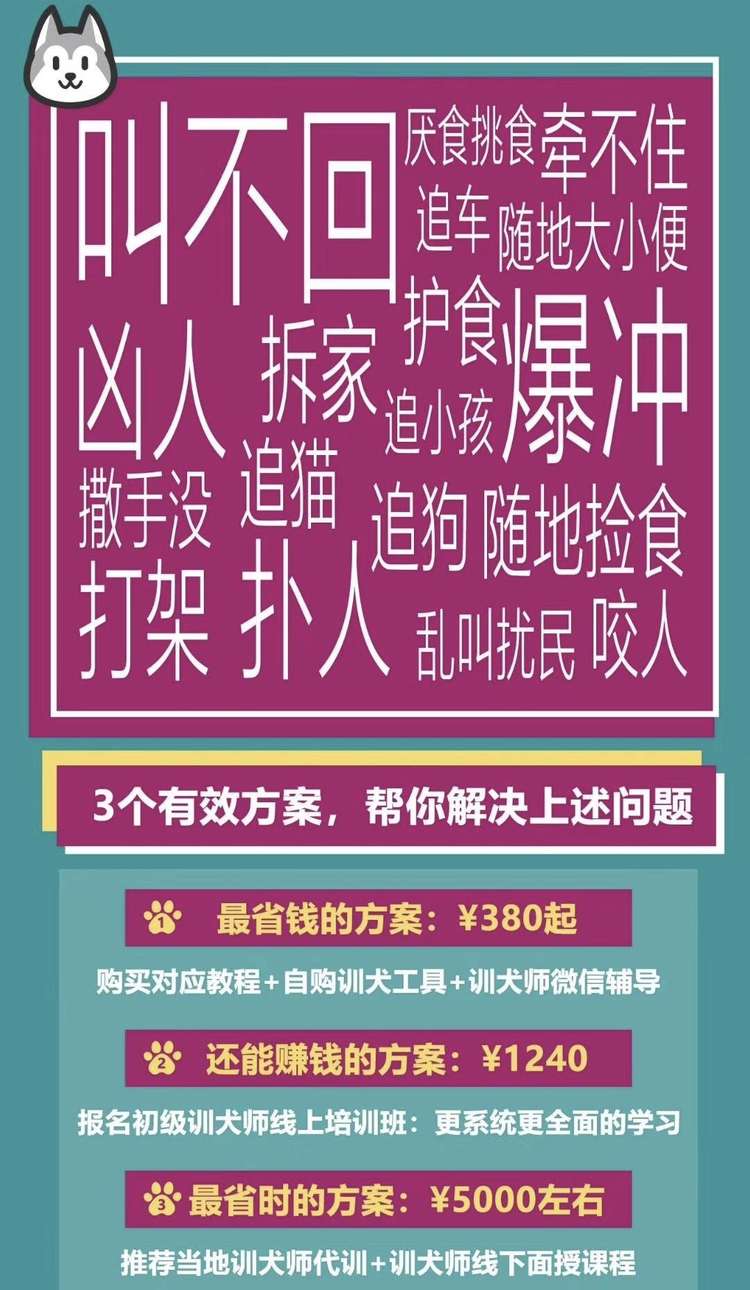 最便宜的380元起價,但屬於遠程教學,需要寵物主人自己購買教程和訓寵工具,專業人員會通過微信遠程輔導。