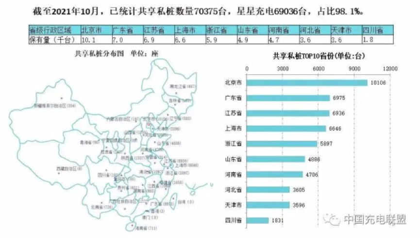 2021年10月各省份充電樁(共享私樁)整體情況,圖源:中國充電聯盟