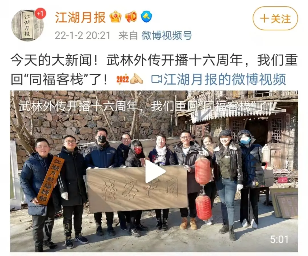 **2019年,@江湖月報 的運營人周洲在江西開了一間仿造同福客棧的民宿,****《武林外傳》不僅讓他認識了很多朋友,還讓他改變了自己的職業規劃。**周洲常在同福客棧邀請認識的腐竹們一起聚會,大家會在民宿中模仿劇裏的情節玩,一起包餃子、打地鋪。