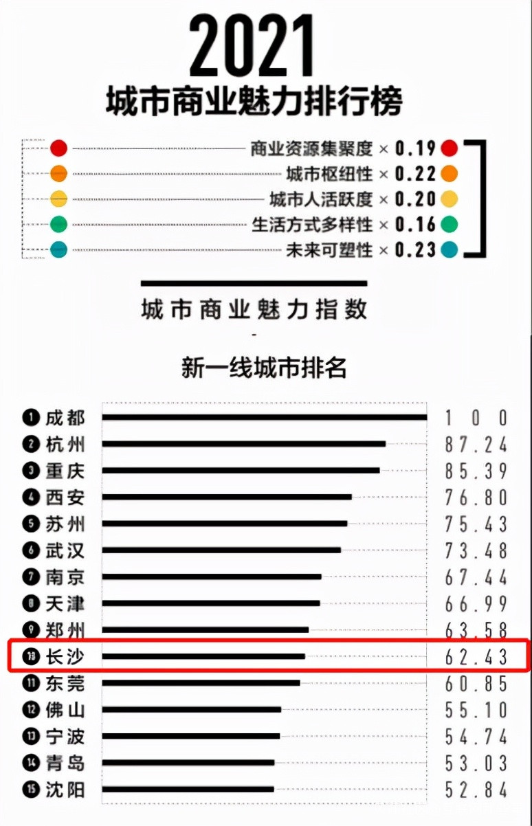 《2021城市商業魅力排行榜》,長沙位列新一線城市第10位,連續5年穩居前十強。2021年長沙酒店預訂量全國TOP10,黃金週的鐵路客流量全國排名TOP5,僅次於北上廣深。