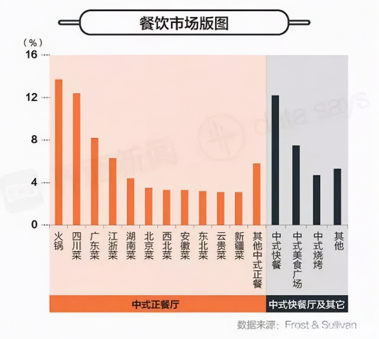 傳統的中國八大菜系中,川菜以35%的市佔位居第一,緊隨其後的是粵菜18%、江浙菜16%、湘菜13%。