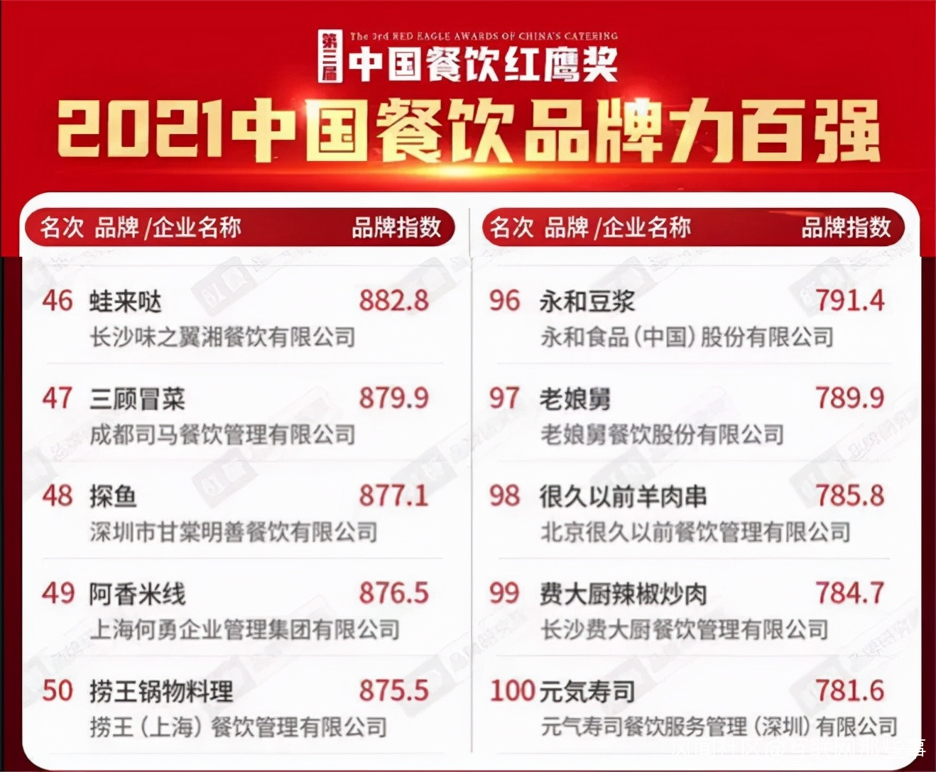 《2021中國餐飲品牌力百強榜單》中就已經出現了超級文和友、茶顏悦色、費大廚辣椒炒肉、蛙來噠等湘菜品牌。