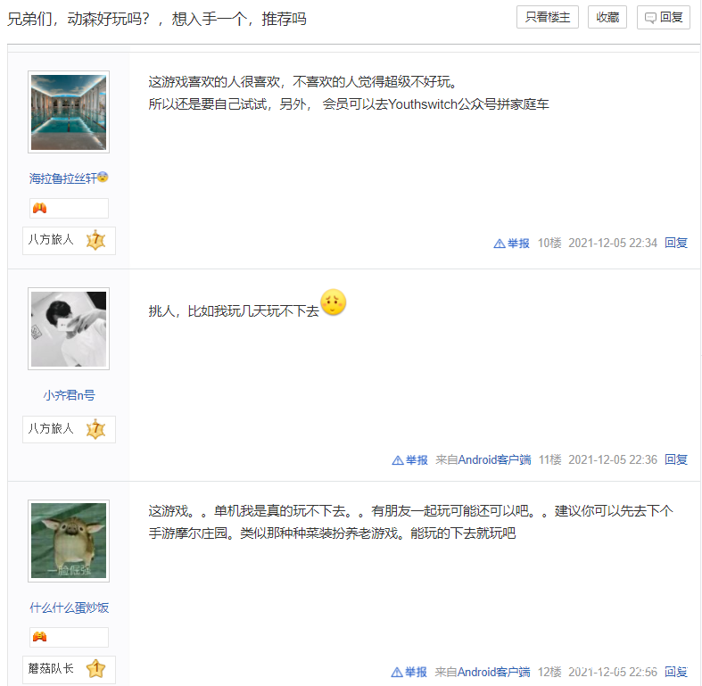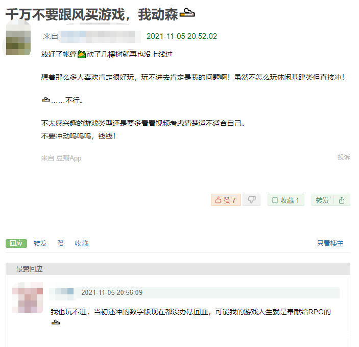 不僅如此,如果你平日裏閒着無聊就翻翻遊戲社區,你會發現動森這遊戲的口碑,和發售時的好評如潮完全不一樣了。特別是在2.0更新前的一段時間,有太多人表示,後悔當年跟風買了這款完全不適合自己的遊戲。