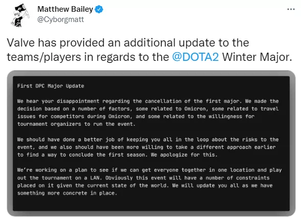 V社顯然在劈頭蓋臉的批評聲中意識到直接取消比賽是一件極為草率的行為。昨天,Secret戰隊經理在社交媒體上透露了一條V社發給戰隊的信,信中解釋了比賽取消的原因,稱一方面是因為疫情相關原因,另一方面則與賽事承辦方的意願改變有關。