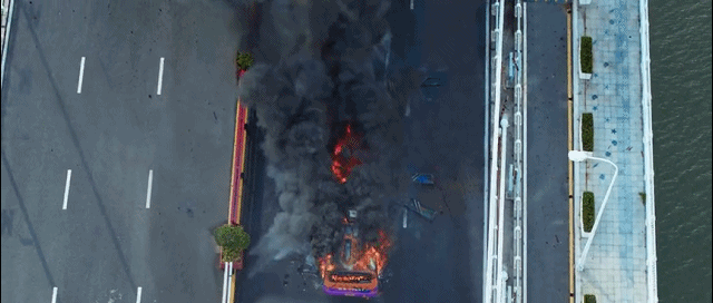 在兩人的千叮嚀萬囑咐之下,公交車沒有與油罐車相撞,車子正常行駛到了橋中央。