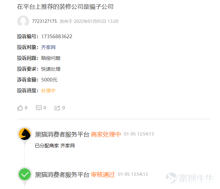 針對這一現象,《港灣商業觀察》查詢黑貓投訴發現,有眾多類似事件,消費者對於齊家網所推薦的裝修公司存在大量“差評”。