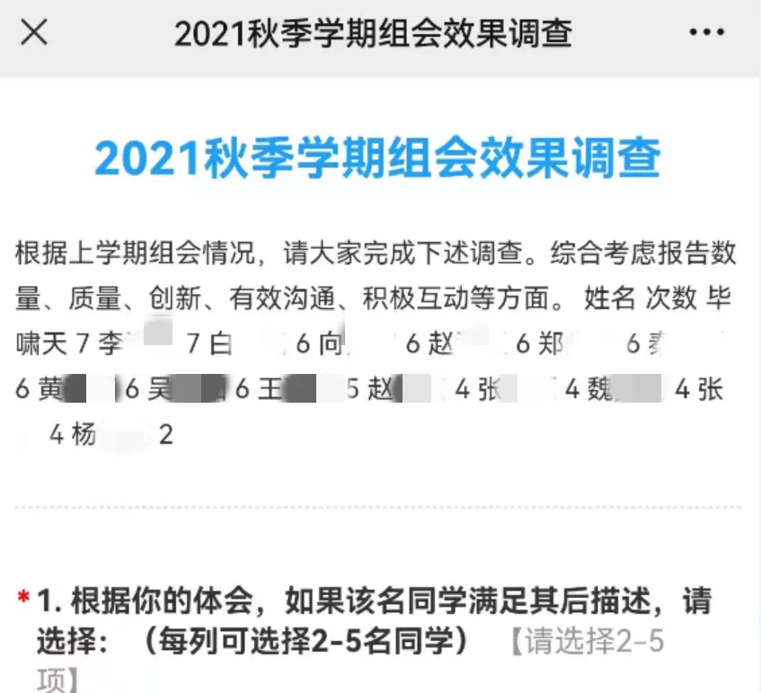 點開問卷第1題,有點意思!導師將優秀的組會劃分為7個維度,讓我們互評。