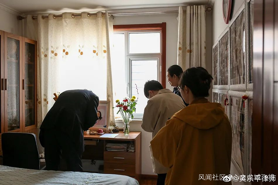 2021年4月16日,黃樂平律師團隊第一次上門拜訪江秋蓮,在江歌的遺像前鞠躬致意。受訪者 供圖
