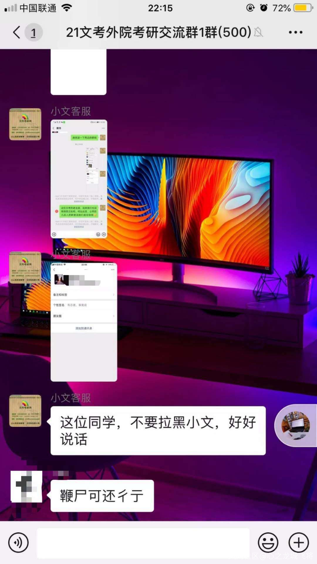 張銘提供的幾張微信聊天截圖顯示,疑因一位文考網“老主顧”在羣眾説了一句“文考垃圾”,便被一位名稱為“小文客服”的微信用户,將其微信賬號、頭像及聊天記錄等發在一個500人的考研交流羣中。