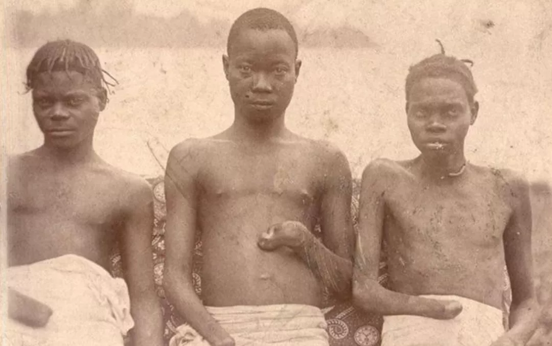 如果剛果人沒有採集到足夠的橡膠上交,就砍掉他們妻兒的手…..這些被砍掉的手,居然成了交易市場上的“貨幣”。在當時剛果自由邦裏有成千上萬的黑人沒有手腳,有許多照片和文獻資料都證明了比利時橡膠公司的殘酷,比如下圖這一張由著名攝影師愛麗絲·西利·哈里斯於1904年在剛果自由邦拍攝的照片。