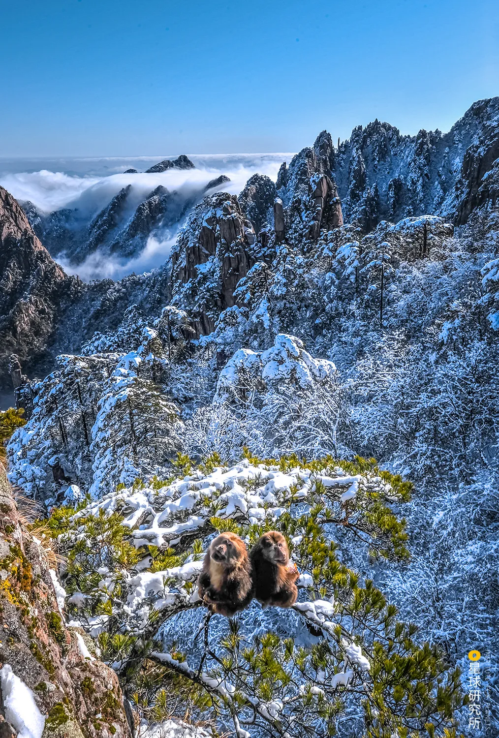 (兩隻黃山短尾猴依偎在黃山松上,黃山是我國四個世界文化與自然雙重遺產之一,攝影師@羅銘)