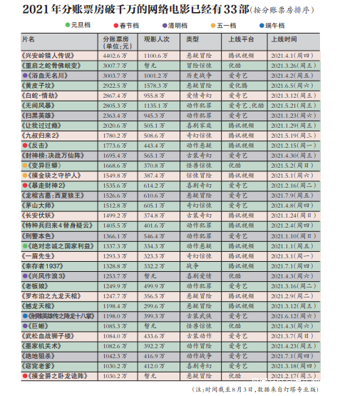 對比三家平台的成績單,千萬以上分賬票房中,愛奇藝佔29部,騰訊佔21部,優酷佔11部,不難看出愛奇藝仍然佔據着優勢地位。